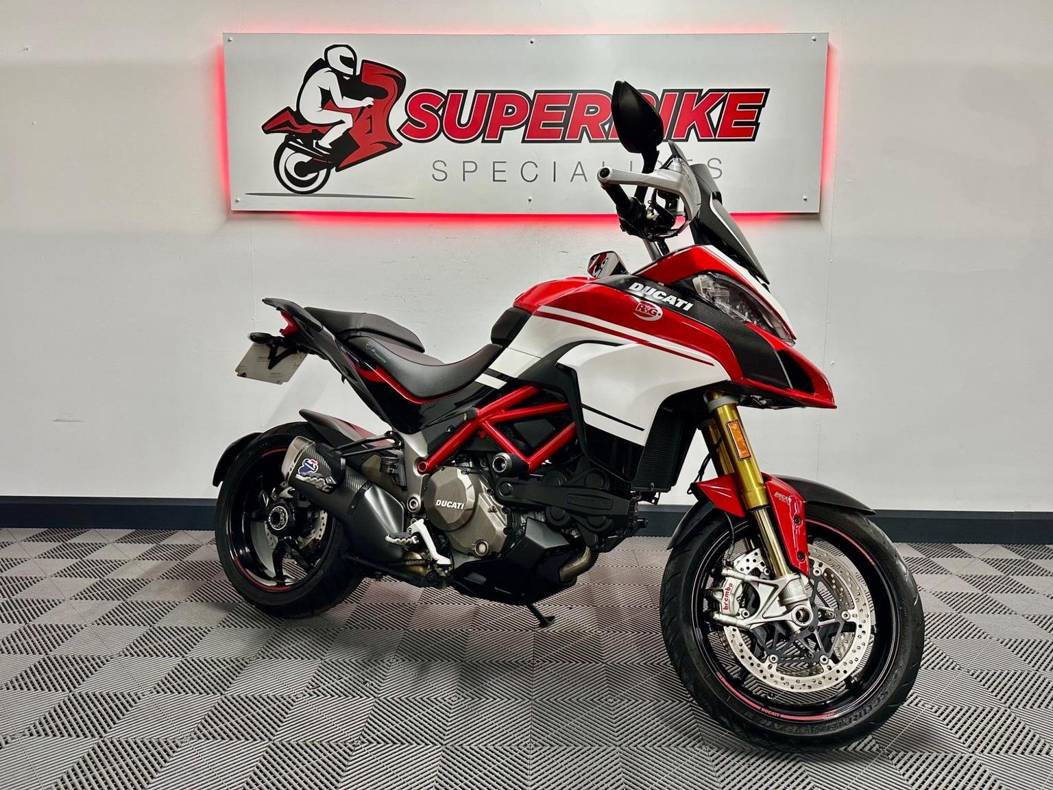 The 2016 Ducati Multistrada 1200 Pikes Peak is a sports-touring motorcycle with a race-inspired design and enhanced performance components. It's based on the Multistrada 1200 S but features a dedicated livery, Öhlins suspension, Termignoni exhaust, and lightweight carbon fiber parts. The engine utilizes the revolutionary Ducati Testastretta DVT with Desmodromic Variable Timing, offering a broader range of power and torque.